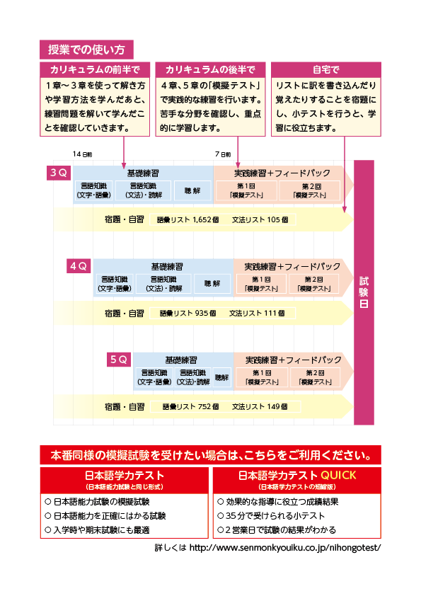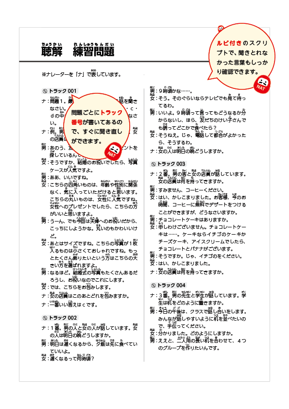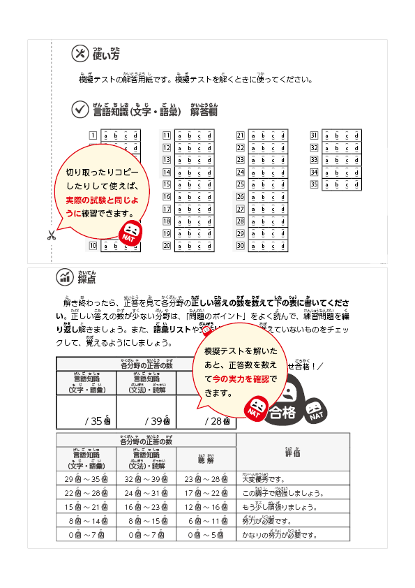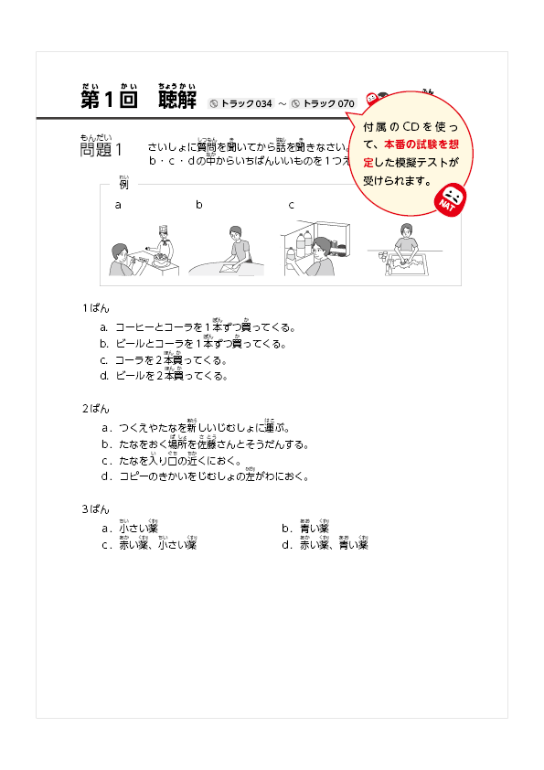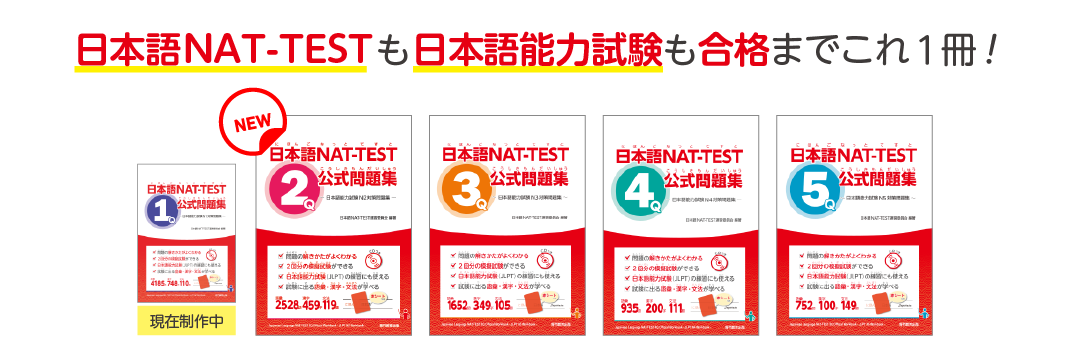 | 日本語NAT-TEST5級公式問題集 ~日本語能力試験N5対策問題集~ | B5、136ページ、CD/赤シート付き | 978-488324-489-8 | 2,300円 | amazon.co.jpでご購入 |